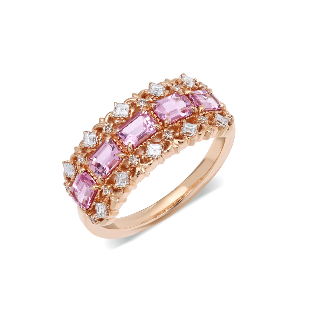 Featuring 1.12tcw emerald cut unheated pink sapphires, accented with 0.32tcw carré cut and round brilliant cut diamonds of F+ color and VS+ clarity.