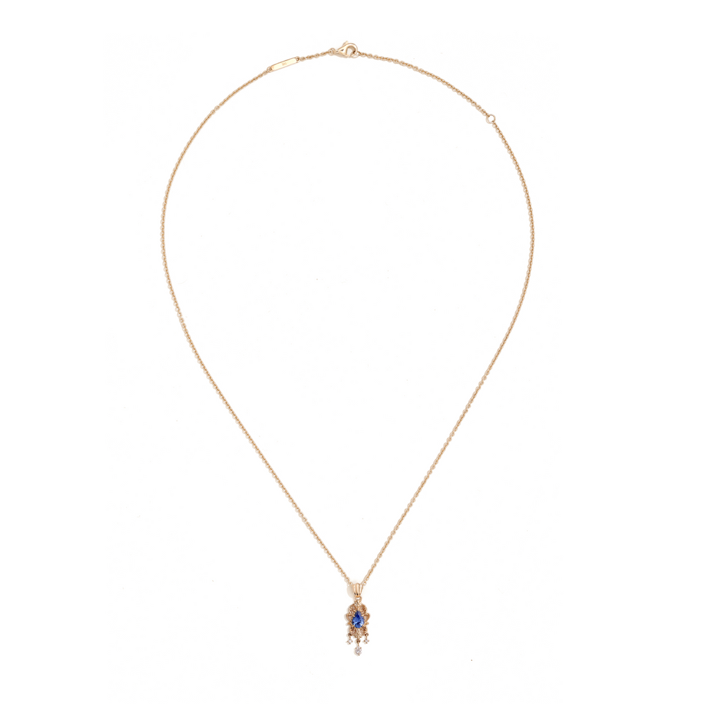 A delicate pendant inspired by the grandeur of early 20th-century jewellery. Its intricate openwork filigree is complemented by gracefully dangling diamonds, creating a subtle sparkle perfect for daily wear. For a complete ensemble, pair it with the Fontainebleau Ring.